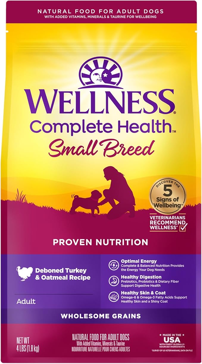 Wellness Complete Health Small Breed Dry Dog Food with Grains, Natural Ingredients, Made in USA with Real Turkey, For Dogs Up to 25 lbs, (Adult, Turkey & Oatmeal, 4-Pound Bag)