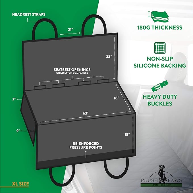 - 𝗘𝗙𝗙𝗘𝗖𝗧𝗜𝗩𝗘 𝗣𝗘𝗧 𝗣𝗥𝗢𝗧𝗘𝗖𝗧𝗜𝗢𝗡: The Rear Seat Cover fits seamlessly over the interior of your vehicle, keeping your pet stable, secure, and protected on all your automotive adventures. The non-slip silicone backing, plastic grounding seat anchors, and silicone side pillows that tuck into backrests prevent any superfluous movement.