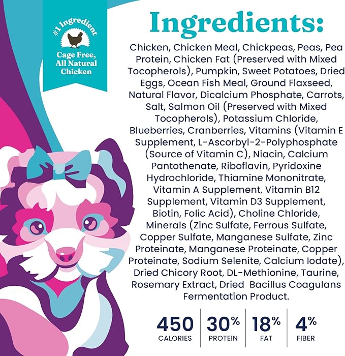 - High Protein Dog Food & No Junk - This kibble dog food provides high protein for dogs from cage free chicken for muscle support and contains no corn, wheat, soy, artificial colorings or preservatives.