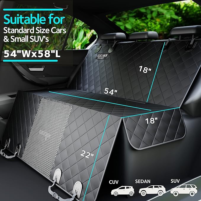 - Perfect size for great backseat coverage - 54"W x 58"L fits most cars and SUVs. Converts between hammock or bench style dog seat cover for easy sharing or full backseat protection. For Vehicle Size Chart Please See Below.