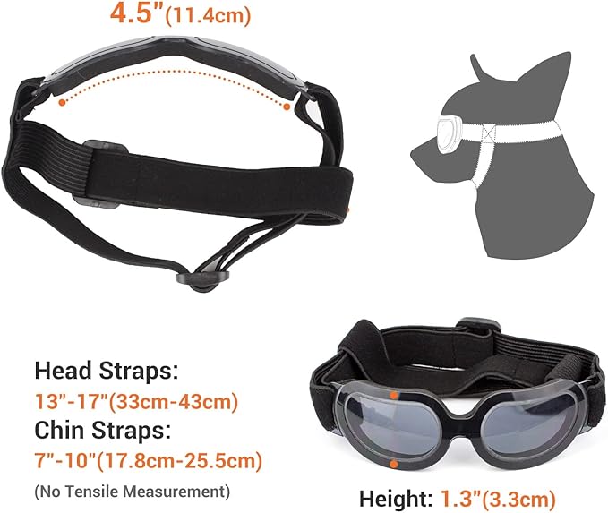 - Only about 0.04lb, these puppy goggles are super lightweight, Height 1.3", Length 4.5". Head strap elastic 13"-17", Chin strap elastic 7"-10", No tensile measurement, have enough to adjust, fit puppies like Yorkie, Pomeranian, Silky terrier, etc.
