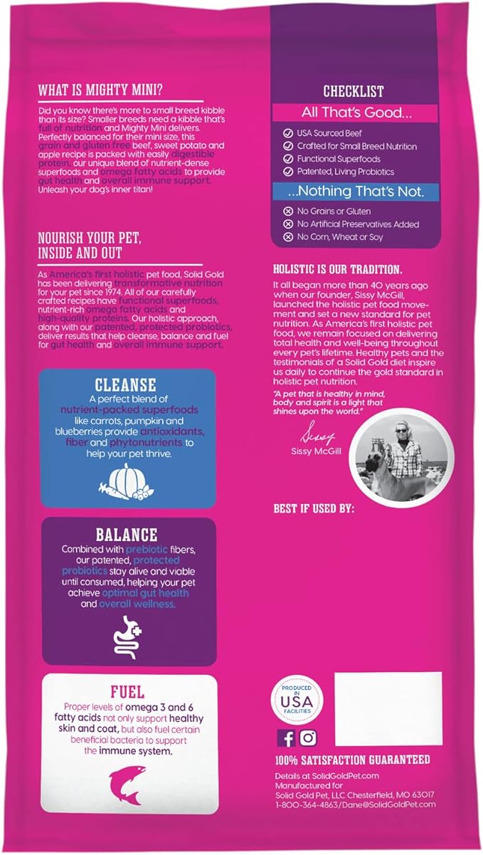 - A 'Mighty' Good Choice for Little Dogs - Solid Gold Mighty Mini is a natural dry dog food made with care to support gut, immune, and coat health for your small puppy, adult, or senior dog breed.