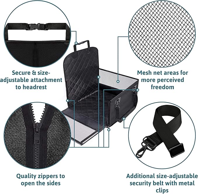 - ✔ FLEXIBLE SIDES: The 33 cm sides are taller, and, thanks to the high-quality fiberglass rods at the seams, much safer than the average car seat for dogs. Using the 4 zippers, they can be folded down, giving plenty of space for large dogs or puppies.