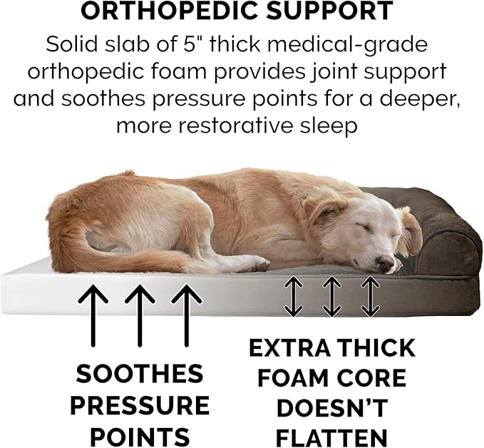 - EASY ON JOINTS: The dense and sturdy solid orthopedic foam base provides superior comfort and greater support for dog breeds of all sizes; fluff-filled bolsters support the neck, back, hips, and joints to help ease discomfort and promote restful sleep