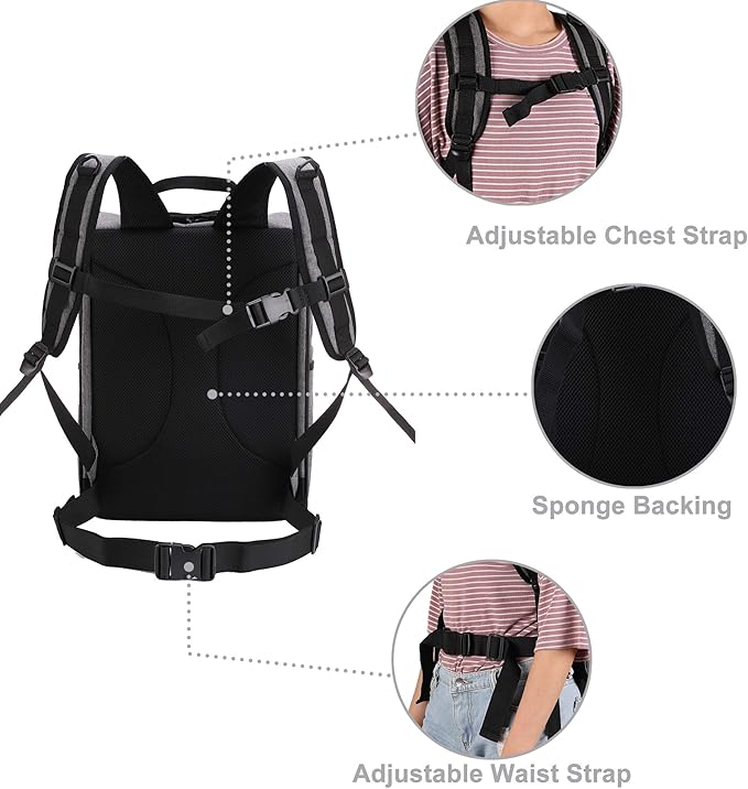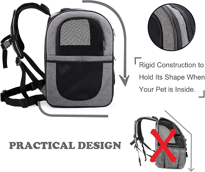 - BETTER CONSTUCTION-Well ventilated design for optimal airflow, two-way entry for easy access, top mesh window for more headroom and visibility, and thick, soft fleece bedding for your pet resting and relaxing. This backpack is firmly structured, providing ample room for your pet to move around.