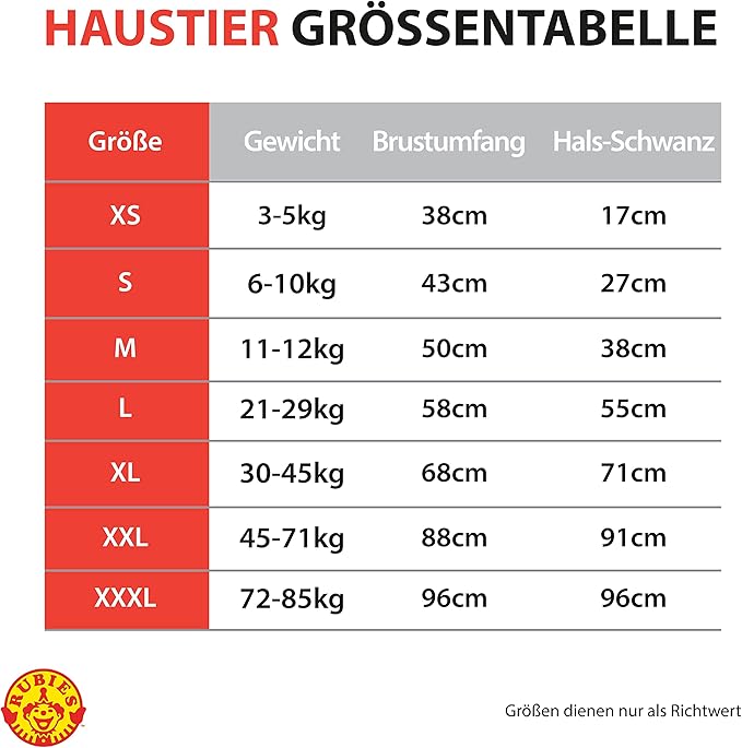 - Read THE RUBIE’S PET SIZE CHART and WATCH THE SIZING INSTRUCTION VIDEO, do not select size based on breed
