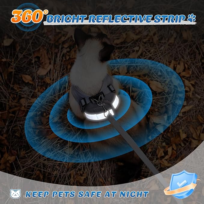 - Safer And Better Control: Our cat harness with reflective stripe can reflect ambient light in extreme low-light conditions, ensuring maximum visibility when night running; This outdoor kitten harness features a sturdy D-ring on the back to attach to a leash. Its vest-style design can evenly distribute leash pressure across the chest and shoulders to prevent choking or neck strain, which offers much more comfort and security than a basic halter or H-style harness.