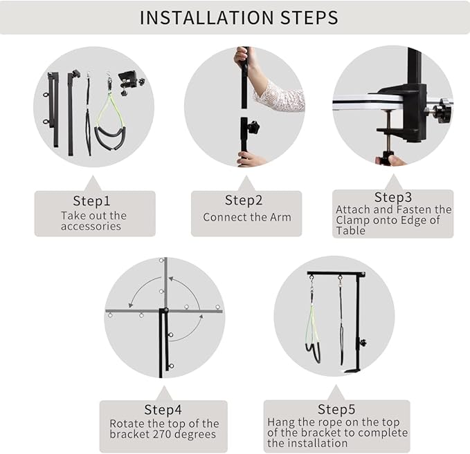 - Ajustable Height: The height of this pet grooming arm is up to 35.5 inches and the height can be easily adjustable by the CLAMP to meet your need. This pet grooming arm is suitable for pets under 30lbs.