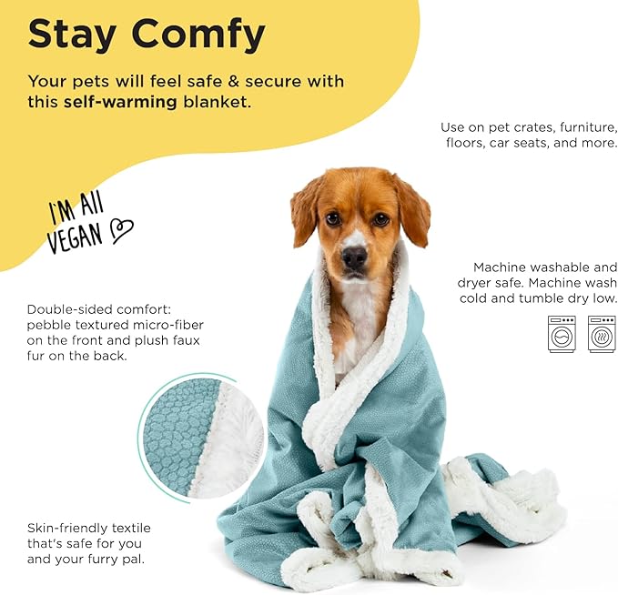 - PREMIUM MATERIALS: Made with 100% Polyester pet safe material this blanket consist of a plush textured microfiber on the front and an ultra soft vegan fur on the back. Your pets will feel safe and secure with this self-warming blanket that is reminiscent of a mother's fur coat.