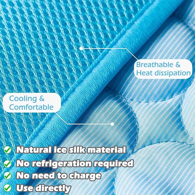 - 🐕 High-Tech Ice Silk Material: Different from the traditional dog mat, the surface of this dog cooling mat is a self-cooling ice silk fabric, and the inner filling is a heat-absorbing and water-absorbing material, which has a strong absorption capacity and can control urine and odor. The mesh is a heat-dissipating material, very soft and breathable, so the whole design is to make your pet feel cool the moment it touches it.