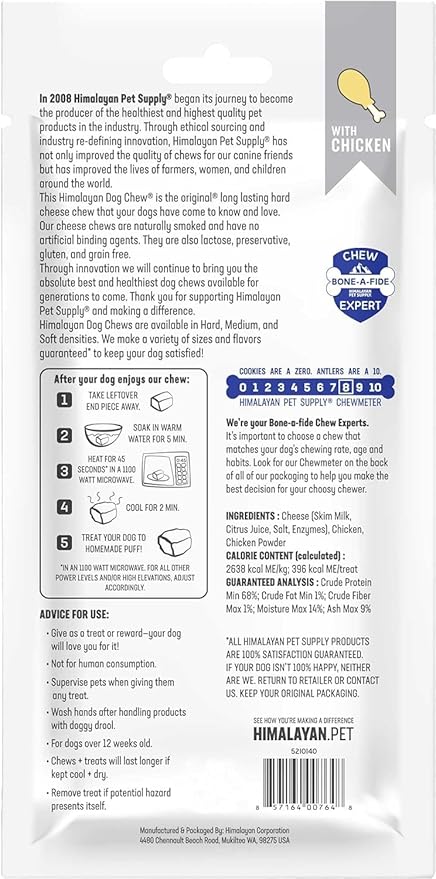 - CHICKEN FLAVOR: Included is one extra large, 5.3 oz chicken flavored Himalayan yak cheese stick - made using our traditional Himalayan cheese recipe, but with added bits of chicken for more flavor! Ideal for dogs 55 pounds and over, not for dogs younger than 12 weeks.