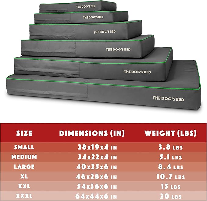 - XXL Grey with Dark Green Trim (Easy Clean Cover) 54x36x6” waterproof orthopedic dog bed. Solid 2” high density, orthopedic memory foam over a solid 4” base of high stability support foam with covers designed so that your bed fits your home decor seamlessly and your dog can stay close to your family