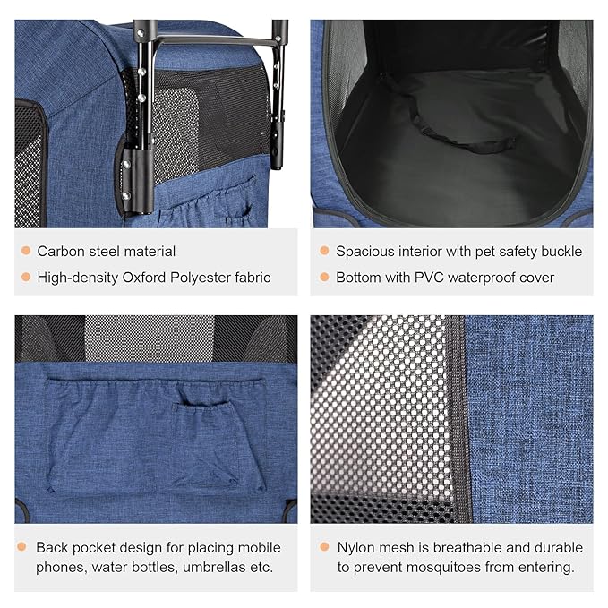 - 【Unique Wheel Design】360 rotatable front wheels (8 inch) and large diameter rear wheel (12 inch), this dog pushchairs adapts different types of roads and passes the obstacle easier. Give your pal a comfortable experience.