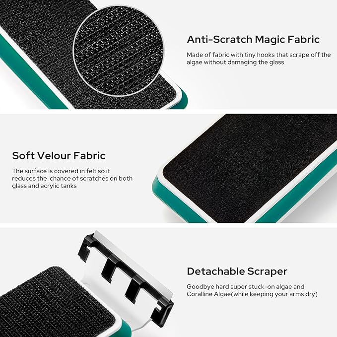 - Premium Quality: The scrubber side (inside) is made of an anti-scratch magic sticker that scrapes off the algae without damaging the glass. Outside is a Wear-resistant soft suede brush to insure it glides smoothly along as you clean.
