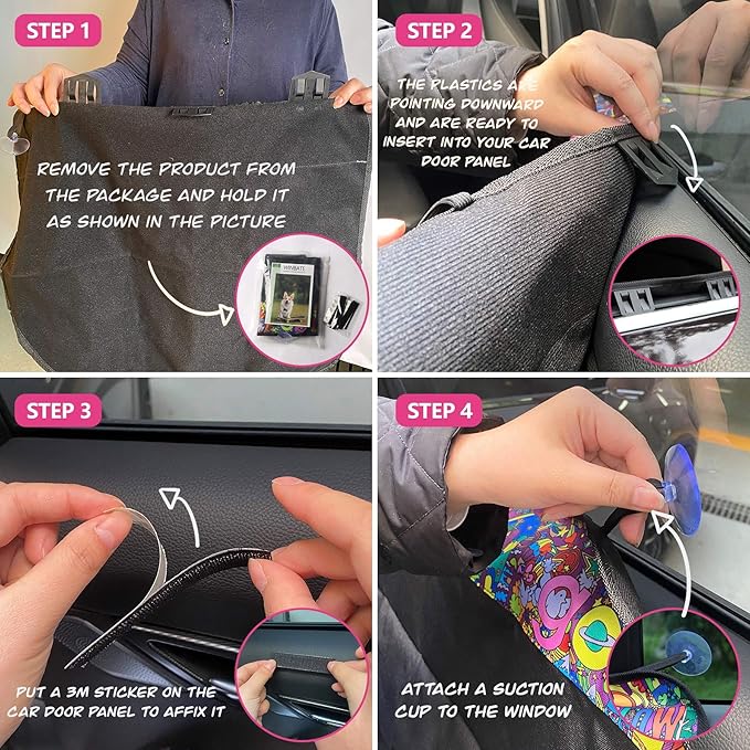 - FAST & CONVENIENT INSTALL: These door cover provide 3 ways to give you a safe driving experience. 1. Insert the tabs into the window gap. 2. Use the 3M glue to fix the car door cover and there don’t have trace when you remove the glue. 3. Attach suction cups to the window. Only takes 60 seconds, you will be ready to go!