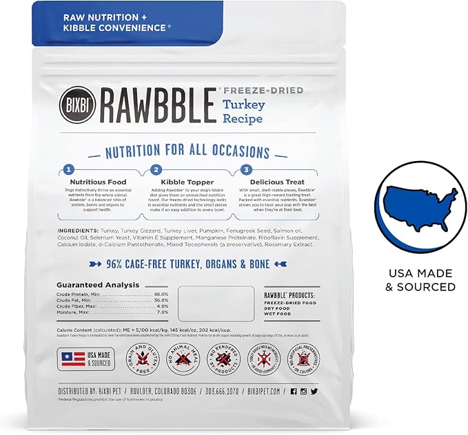 - USA MADE AND SOURCED: A great alternative or complement to wet dog food and dry dog food, BIXBI Rawbble Freeze Dried Dog Food is proudly made in the USA from USDA certified animal proteins sourced in the USA