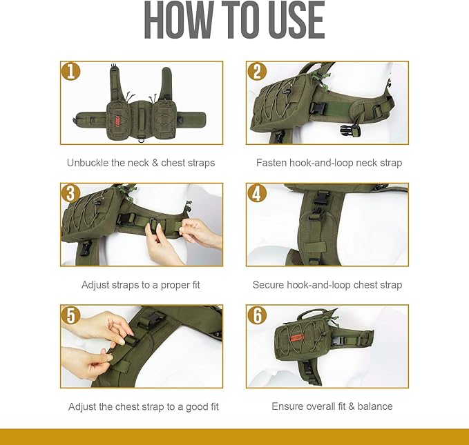 - Hook-and-loop belly strap with UTX-Duraflex buckles so the pack stays in place and wrap dog's neck & belly around well
