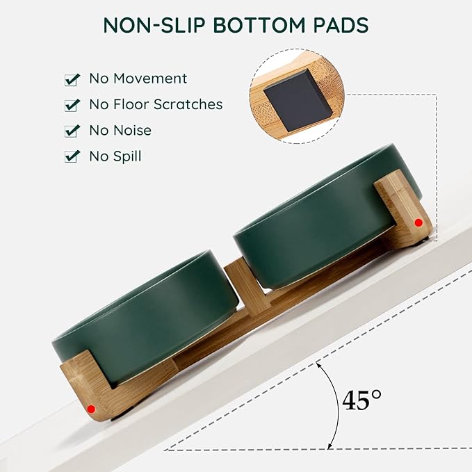 • Double Bowl Design:One dog bowl for food and one for water, Each ceramic cat bowl has a Unique wooden stand, raising the dishes closer to your pet for more comfortable eating