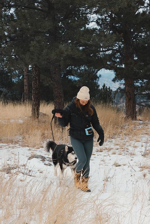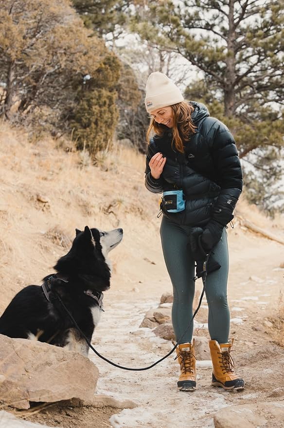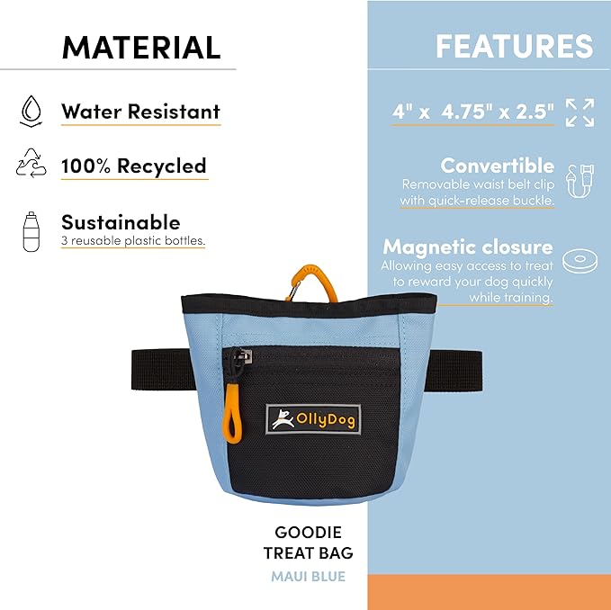 - FUNCTIONALITY & DURABILITY: Crafted with a vegan, non-toxic, recycled fabric that is water- resistant. The Goodie Treat Bag repurposes 3 plastic bottles into the perfect training treat pouch. Lightweight and easy to wear so that you have quick access to treats to reward your dog's good behavior while training. This bag can be worn around the waist, clipped onto a belt-loop, or threaded onto your personal belt. If there are any product issues or defects contact us so we can make it right!