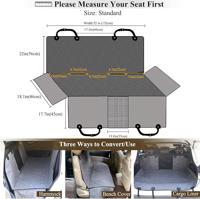 - ⭐Versatile Uses⭐ Pull down the zipper, your family can share rear seat with dog; Extra Strap secures mesh window, providing your dog more safety area, enjoying traveling time together. This half dog hammock can easily convert to a full hammock, bench cover or a trunk liner