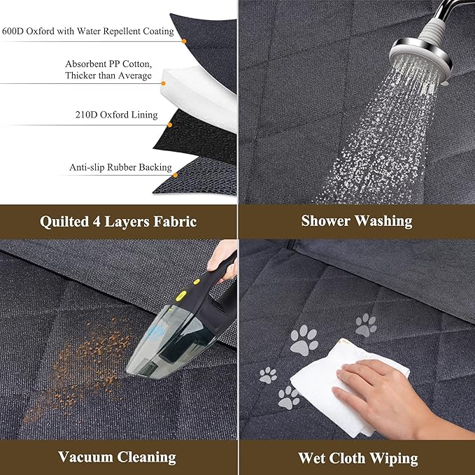 - ⭐DURABLE & EASY CLEAN⭐ Made from heavy-duty 600 denier fabric with water-resistant coating, lining & backing and absorbent thicker PP cotton, this dog back seat cover is comfortable & durable for added protection against liquid and spills. Easy clean with a damp cloth, vacuum or raise it with a shower