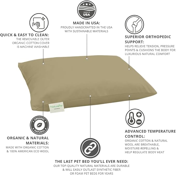 - NATURAL: NaturoPet pet beds are made of natural materials, creating a healthier and safer environment for your pets and your family; Virgin wool is naturally breathable, sustainable and helps control your pet’s unique body temperature; The inner and outer organic cotton covers are lightweight, soft and breathable