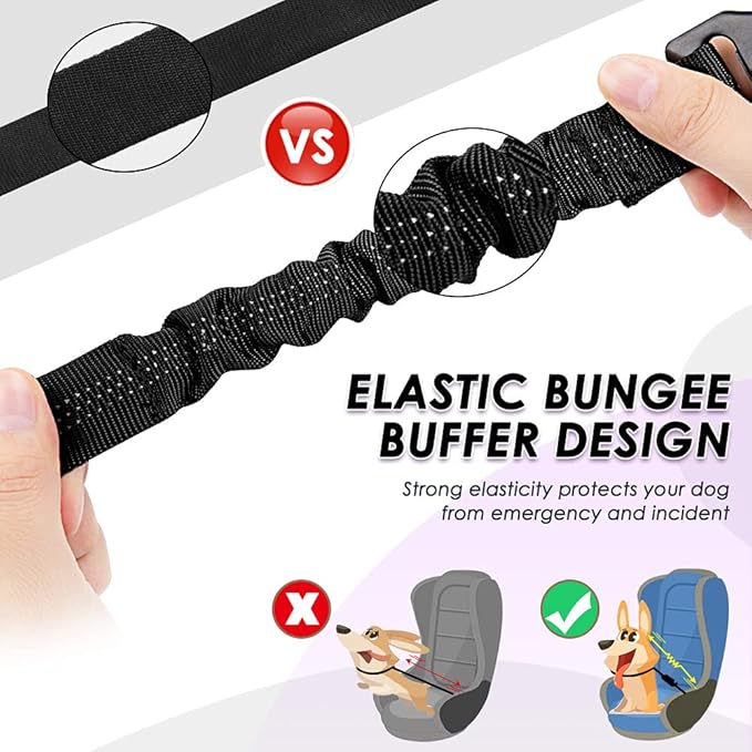 - Well-made and Special Design --- The buckle of this seat belt is sturdy and the hardware is all metal while the straps are made of durable nylon. The reflective stitching design makes it great for night time use. The elastic bungee helps dog prevent jerking with sudden movement