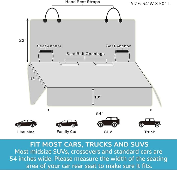 - 54"W x 50" L UNIVERSAL FIT BENCH STYLE: 54"W x 50" L can accommodate enough space for more than 2 large dogs. Most midsize SUVs, crossovers and standard cars are 54 inches wide. It offers your dog 15 inches empty space around the car window compares to the hammock style so he or she can look out of the window while you’re driving.
