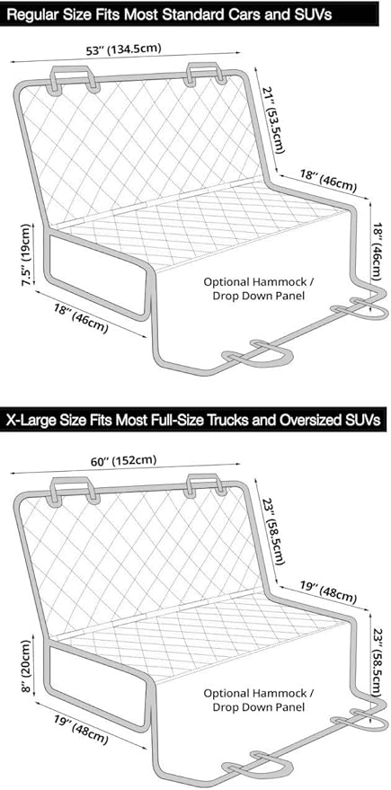 • ◆TWO SIZE - 53"x57" Regular size fits most standard cars and SUVs, 60"x65" X-large size fits most fullsize trucks and oversized SUVs, perfectly protects Back Seats From Dirt, Spills, Scratches, Hair & Fur, And Other Mess.