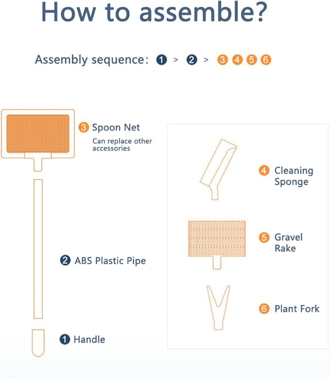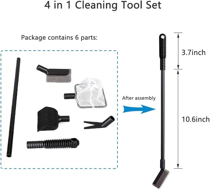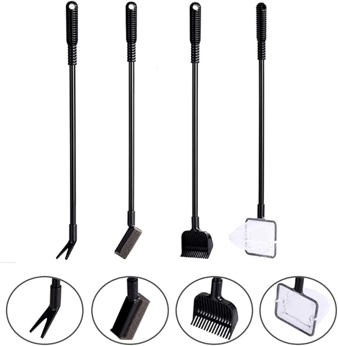 - Products Attributions: Adjustable handle, which can be easily assembled and disassembled with the strap. The fish cleaning set is designed for cleaning many kinds of dust, algae, and fish poops, gravels, plants, etc. The aquarium cleaning set is professional, which included 1pcs clean sponge head, 1pcs spoon net head, 1pcs gravel rake head, 1pcs plant fork, each one is professinal using.