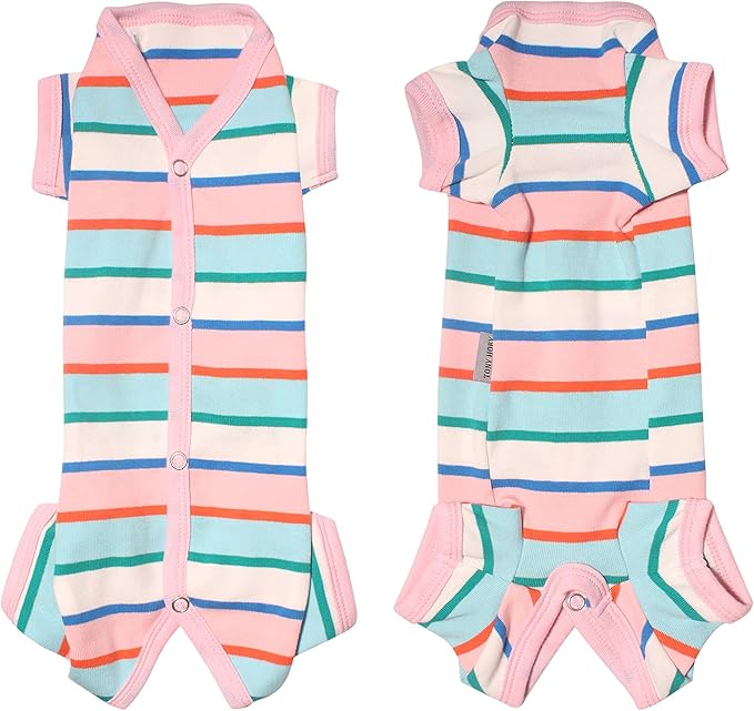 - ❤【Unique Design】-TONY HOBY Female/Male Dog Pajamas has a unique design for men and women, focusing on protecting the dog's abdomen; and using metal buttons, easy to wear; unique four-leg design, elastic waist, and with bright stripes, beautiful and fashionable