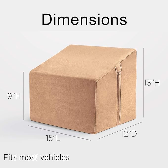 - FITS MOST VEHICLES Measuring 15"L x 12"D x 9"–13"H, this seat extender is designed to fit most cars and SUVs. The foam wedge is lightweight making it easy to remove when you need space for “2-legged”passengers.