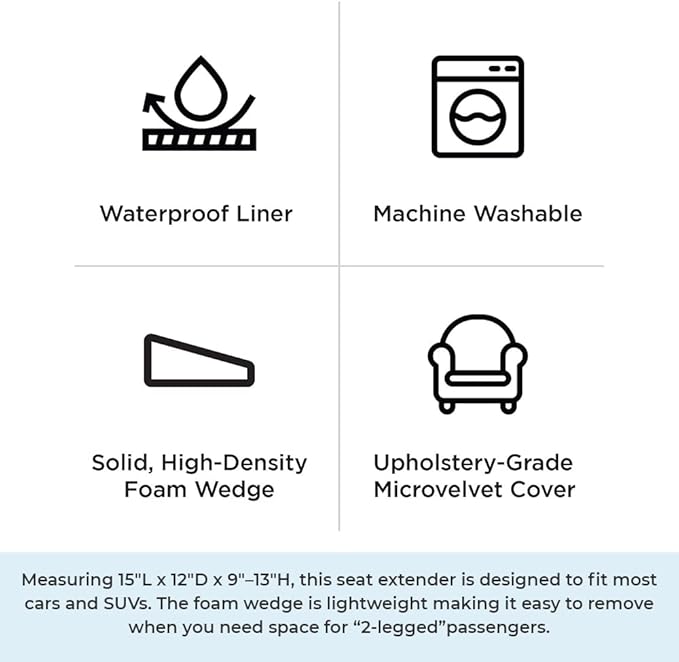 - FITS MOST VEHICLES Measuring 15"L x 12"D x 9"–13"H, this seat extender is designed to fit most cars and SUVs. The foam wedge is lightweight making it easy to remove when you need space for “2-legged”passengers.