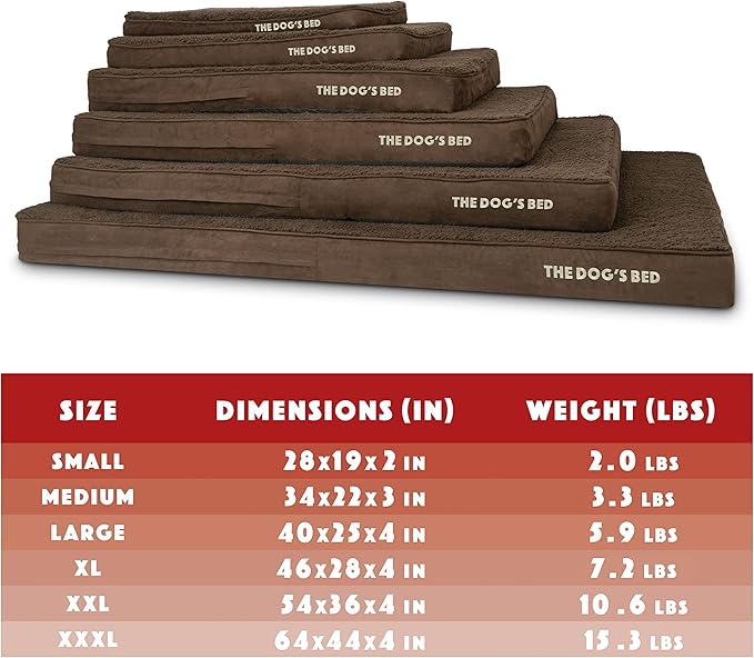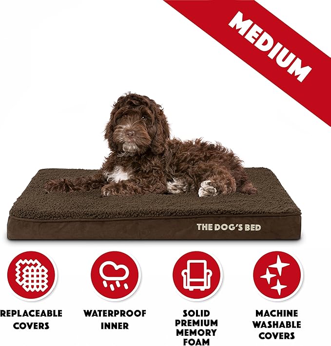 - Medium Brown Plush 34x22x3” waterproof orthopedic dog bed. Solid 1” high density, orthopedic memory foam over a solid 2” base of high stability support foam with covers designed so that your bed fits your home decor seamlessly and your dog can stay close to your family