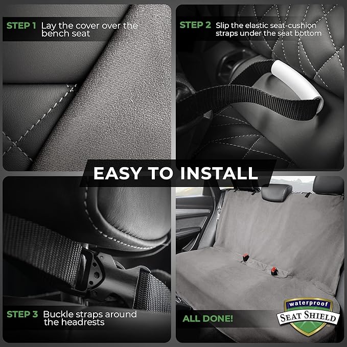 - EASY TO INSTALL BACK SEAT COVER : Simply lay the backseat protector over the bench-seat, attach the two top buckle-closure straps around the headrests and slip over the two elastic seat-cushion straps under the corners of the seat-bottom.