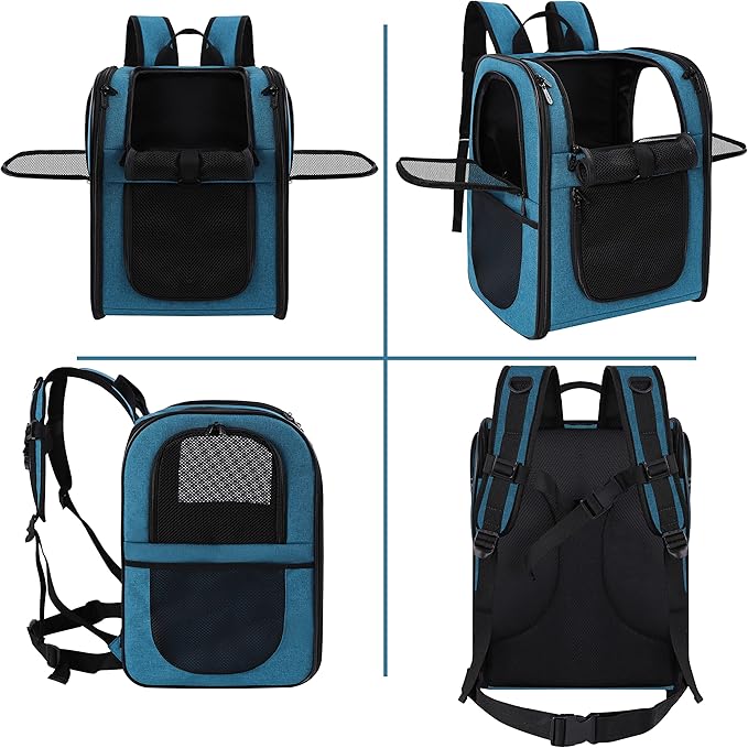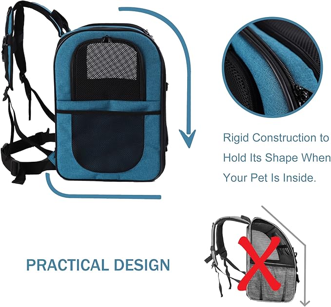 - BETTER CONSTUCTION-Well ventilated design for optimal airflow, two-way entry for easy access, top mesh window for more headroom and visibility, and thick, soft fleece bedding for your pet resting and relaxing. This backpack is firmly structured, providing ample room for your pet to move around.
