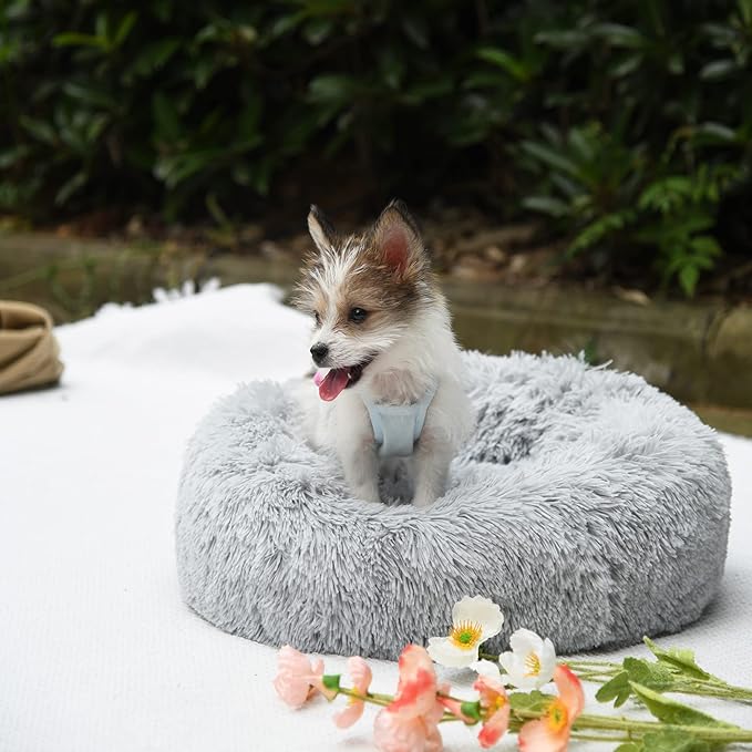 - 【Round Dog Bed Small】Calming donut pet dog beds feature nest-like walls helps your dog curl and burrow like it would in a natural environment ,raised rim provide head and neck support,Furry doggie bed can support better sleep.provides a full sense of security for your pet.Make the dog friendlier, calmer, and less anxious,Can also relieve muscle soreness and joint pain.
