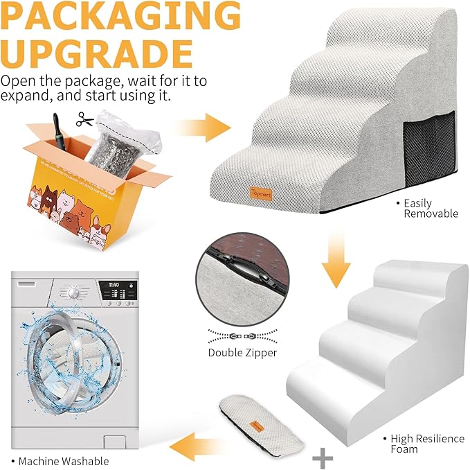 - Waterproof, Washable Cover: The surface of the cover is made of corduroy, the bottom of the dog paw pattern made of silicone, the sides and back are made of suede, all-round to achieve the effect of non-slip. Cover added waterproof layer to protect the sponge from getting dirty. Even if the pet accidentally pee on the dog ladder, will not leave a mark on the sponge. Only need to clean the cover can be. Cover can be machine washed.