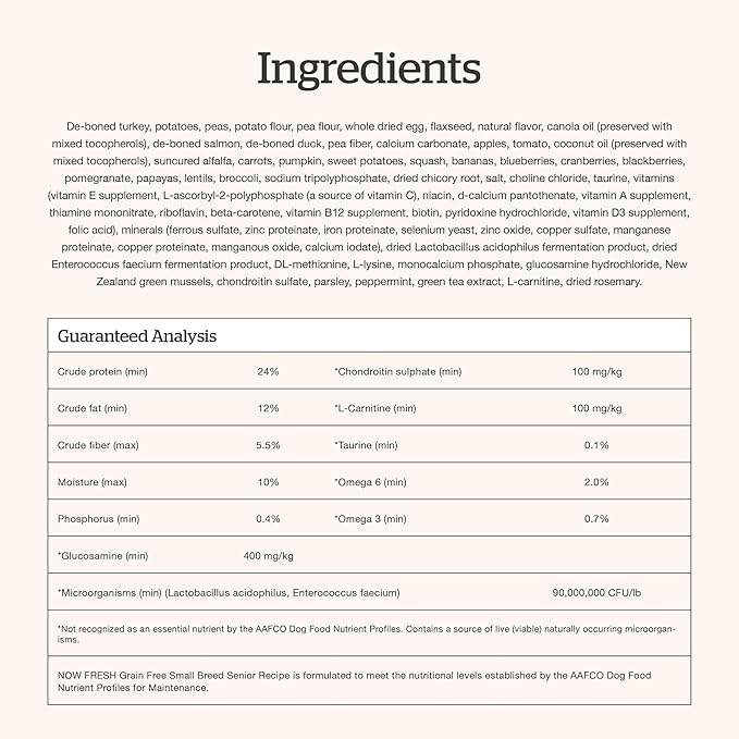 - 1st ingredient is Fresh Turkey: Made with fresh, de-boned turkey, salmon and duck, providing highly digestible protein to help maintain muscle strength and mobility in small breed seniors