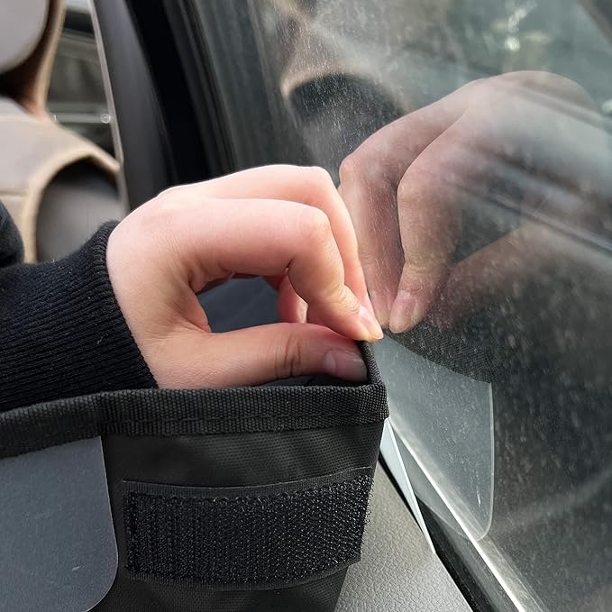 - Using three plastic tabs that are inserted between the window and door frame, you can also use the velcro to install the car door cover