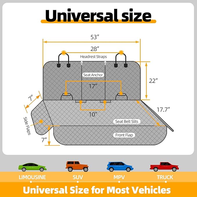 - ✅Universal Size - 53" L x 47" W - The rear seat covers for dogs fits for most standard cars, trucks and SUVs, including baby car seats.