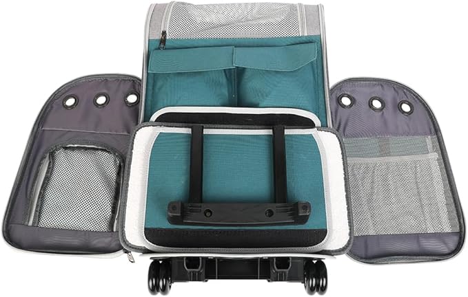 - 【Breathable & Visible】Our cat rolling backpack features mesh panels on the top and sides, ensuring excellent air circulation. The durable mesh material is scratch-resistant and chew-proof, providing a barrier that your pet won't easily tear apart. You can interact with your pet through the top mesh window, helping to alleviate their anxiety. The front of the cat backpack with wheels is equipped with a transparent PVC window, allowing you to observe your pet's condition anytime, anywhere.