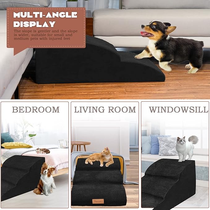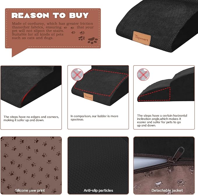 - Safer,Wider&Deeper Steps:Our dog stairs are excellent for those older dogs who are less mobile as they age or for cats with injuries. More wide and deep steps are helpful for reducing the strain that constantly jumping up and down onto lower bed,sofa can have on your pet's joints,and topmart dog steps will not shake and slip during use. The cover made of corduroy is more frictional than other covers, pets will not slip on the stairs.