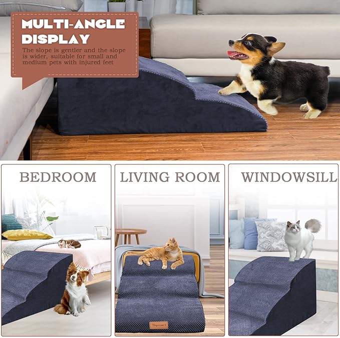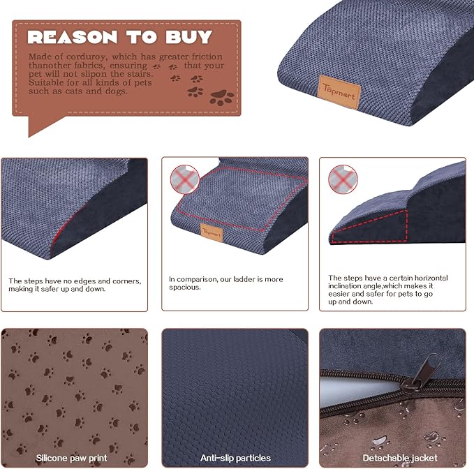 - Safer,Wider&Deeper Steps:Our dog stairs are excellent for those older dogs who are less mobile as they age or for cats with injuries. More wide and deep steps are helpful for reducing the strain that constantly jumping up and down onto lower bed,sofa can have on your pet's joints,and topmart dog steps will not shake and slip during use. The cover made of corduroy is more frictional than other covers, pets will not slip on the stairs.