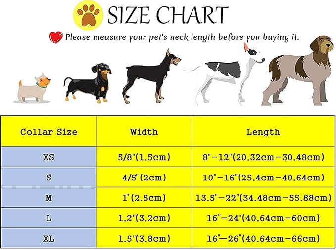 - SIZE: XS Collar (Width:5/8" Length: 8-12"); XS Bow=(length:3.25", width: 1.75"). You need measure your dog neck length before buy the collar.