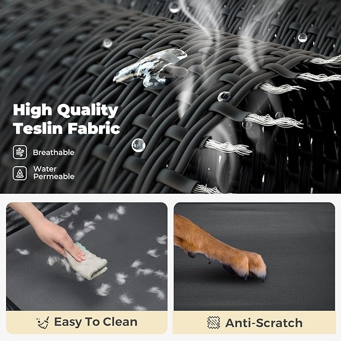 • Stay Cool Ever! Crafted of Textilene mesh fabric, the dog cot allows air to flow, keeping your pets cool while they relax in the heat. Also allow water or urine to go thru, no puddles formed. Besides, the teslin mesh features heat-resistance, sturdy, and breathability.