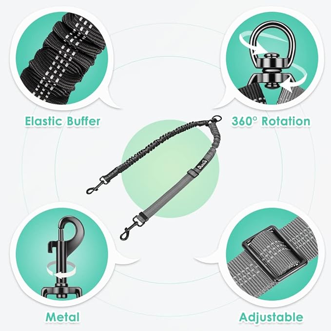 - ELASTICITY & SHOCK ABSORPTION --- Our split lead for two dogs applies a comfortable shock-absorbing bungee design, doubled elastic for the larger dogs, to protect from sudden moves and strong pulling, reduce the pain of dragging dogs and owner.