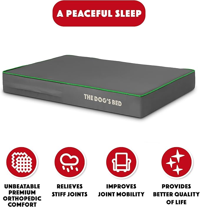 - Medium Grey & Green Trim (Easy Clean Cover) 34x22x4” waterproof orthopedic dog bed. Solid 2” high density, orthopedic memory foam over a solid 2” base of high stability support foam with covers designed so that your bed fits your home decor seamlessly and your dog can stay close to your family
