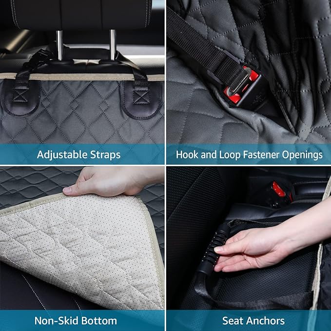 - Non slip and Mesh Window: The seat anchor under the car seat cover can be tucked into the seat back and seat bottom to keep it in place. With anti skid rubber to reduce the movement of the dog car mat to protect dogs safety while driving. With mesh window for airflow and both of you to see each other.