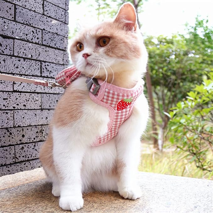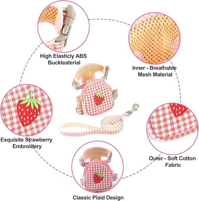 - 🦮BACKPACK DESIGN -- The dog backpack harnesses designed with classic plaid style and strawberry pattern backpack that allows you to carry key, rubbish bag, snacks, tissue and other items on your dog's back. The owner can free his hands when going out with dog!